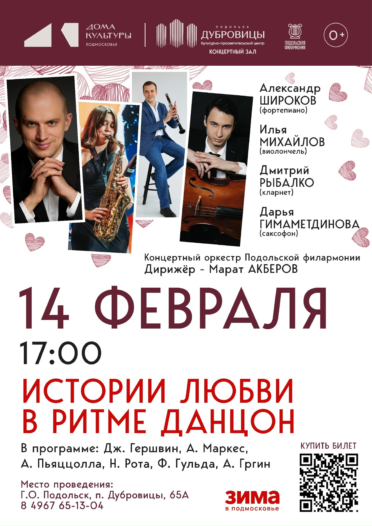 В День всех влюбленных оркестр Подольской филармонии под управлением Марата Акберова представит программу, в которой музыка станет языком любви: от страстного «Либертанго» Пьяцоллы и лирики Нино Роты до зажигательного «Данцона № 2» Артуро Маркеса и бессмертных творений Гершвина.