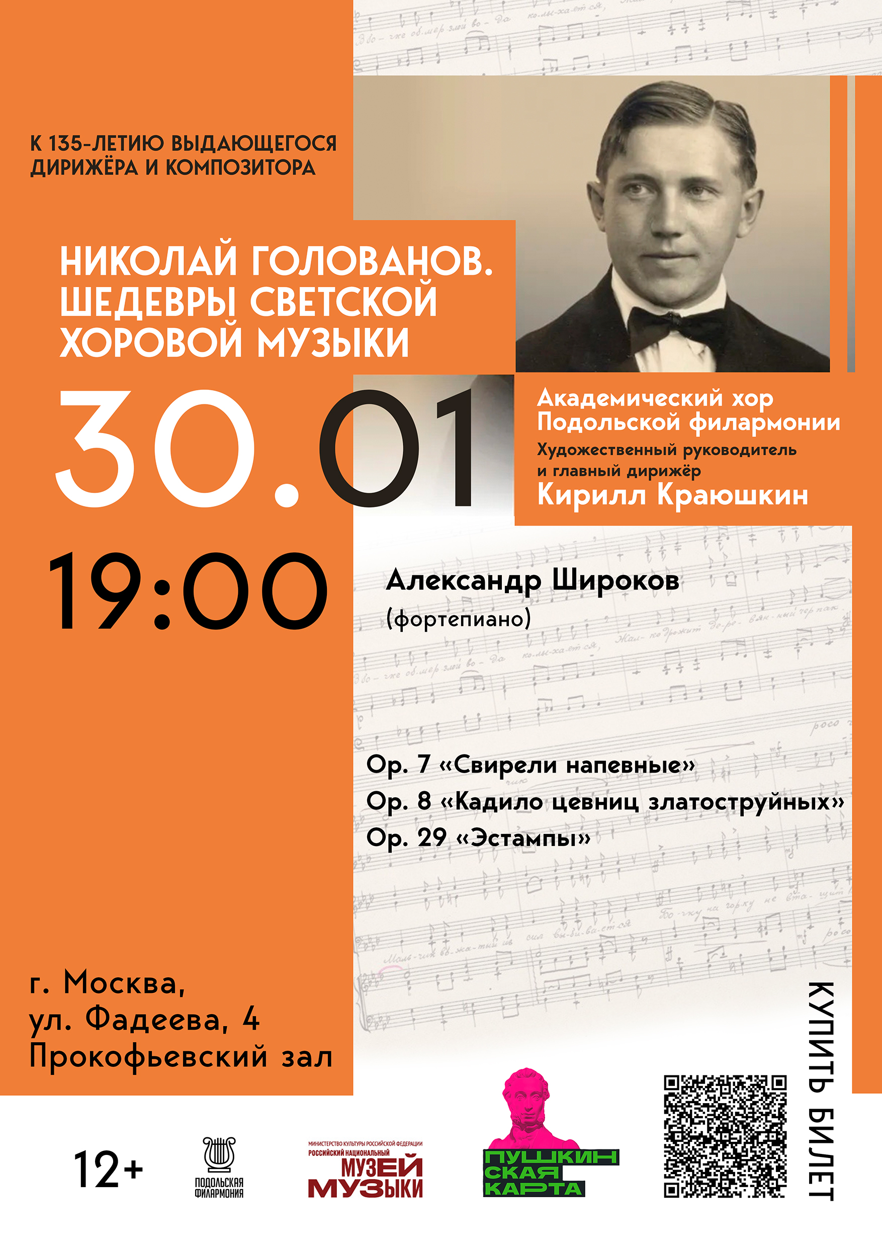 К 135-летию выдающегося дирижёра и композитора. Николай Голованов. Шедевры светской хоровой музыки. Купить билеты Дата 30 Янв 2026 Время 19:00 - 20:15 Цена Вход платный Место проведения Музей музыки г. Москва, ул. Фадеева, дом 4. Прокофьевский зал Поделиться событием