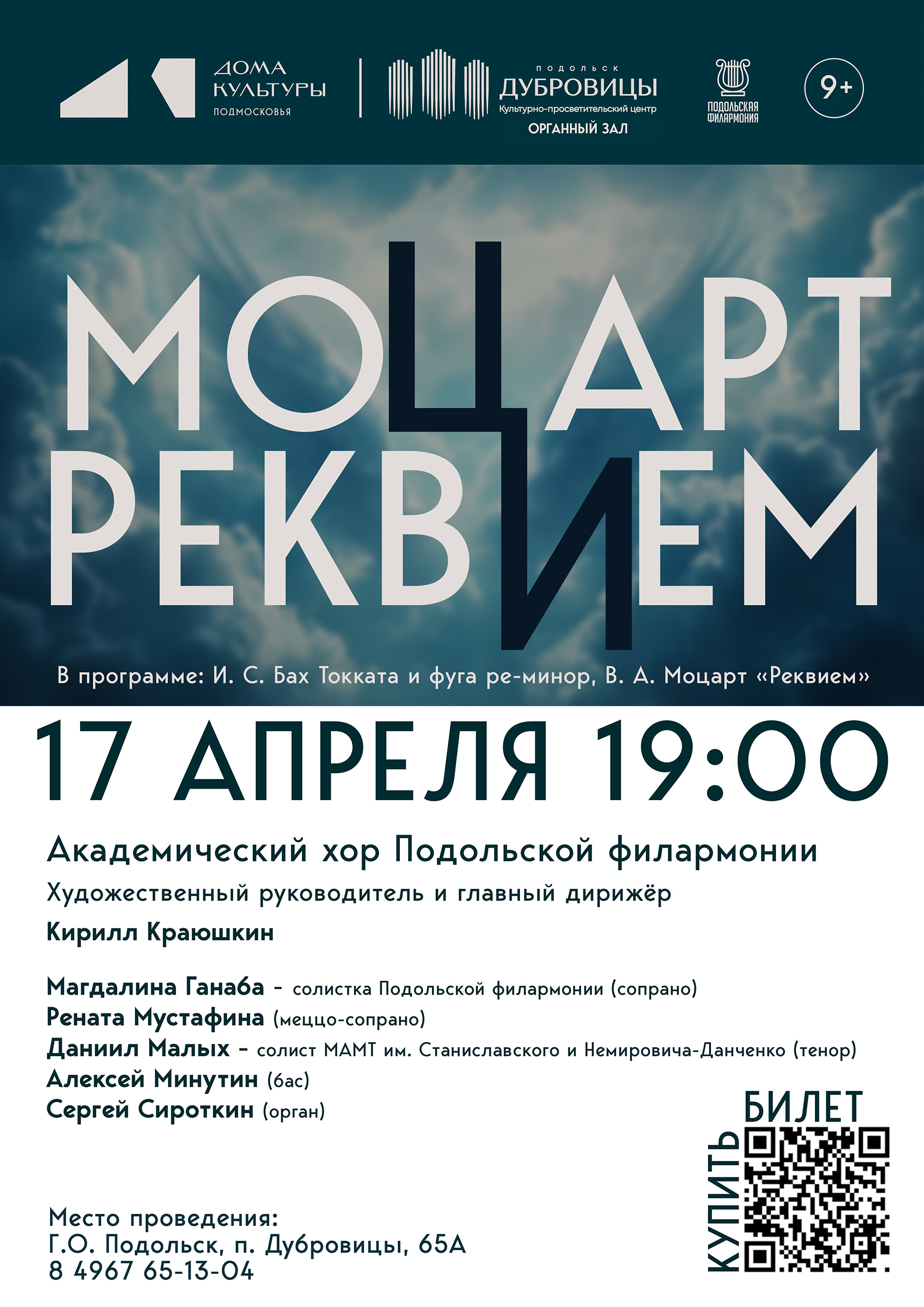 17 апреля в органном зале КПЦ «Дубровицы», в юбилейный год Вольфганга Амадея Моцарта, прозвучит его бессмертный «Реквием» (KV 626), гениальное творение композитора, окутанное ореолом тайны. В этот вечер также будет исполнена величественная Токката и фуга ре минор Иоганна Себастьяна Баха — шедевр, открывающий бездонные глубины органной музыки.